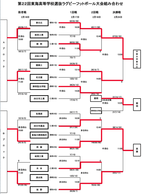 | 星城 | 12 | 11:00 | 愛知工 | 7 | 0 | 14 | 24 | 星城(順延試合) | ||